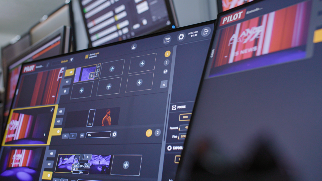 Le logiciel PILOT, développé en interne, permet entre autres de rappeler des séquences de mouvement sur un couple Dolly/Lift/Head (Motion Control) pendant qu’une position-clé est rappelée sur une autre et que l’opérateur avec le pupitre de pilotage contrôle manuellement une troisième. Le réalisateur a donc un large choix de plans maîtrisés qu’il peut mettre à l’antenne à tout moment.