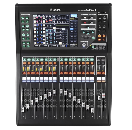 L’ensemble des sources audio (micros, signaux extérieurs et video players) est relié à une console son YAMAHA QL1. Cette console dispose d’E/S Dante et gère le N-1 des contributions extérieures.